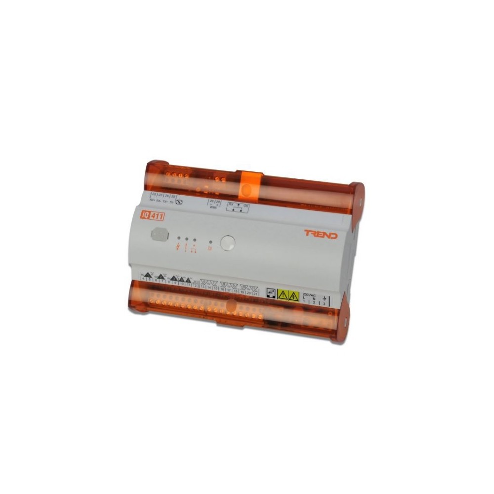 Trend IQ412 Controllers are designed for use as unitary controllers in building control systems. Full compatibility with other Trend IQ controllers enables the IQ41x to integrate the local environmental needs with the bulk air conditioning system in order to optimise both comfort and running costs. The IQ412 Controllers have 5 inputs (3 universal, 2 digital) and 6 outputs. The IQ412 has 4 solid state digital outputs and 2 analogue voltage outputs.