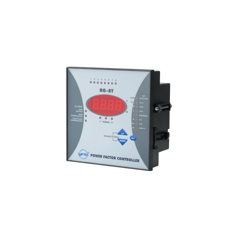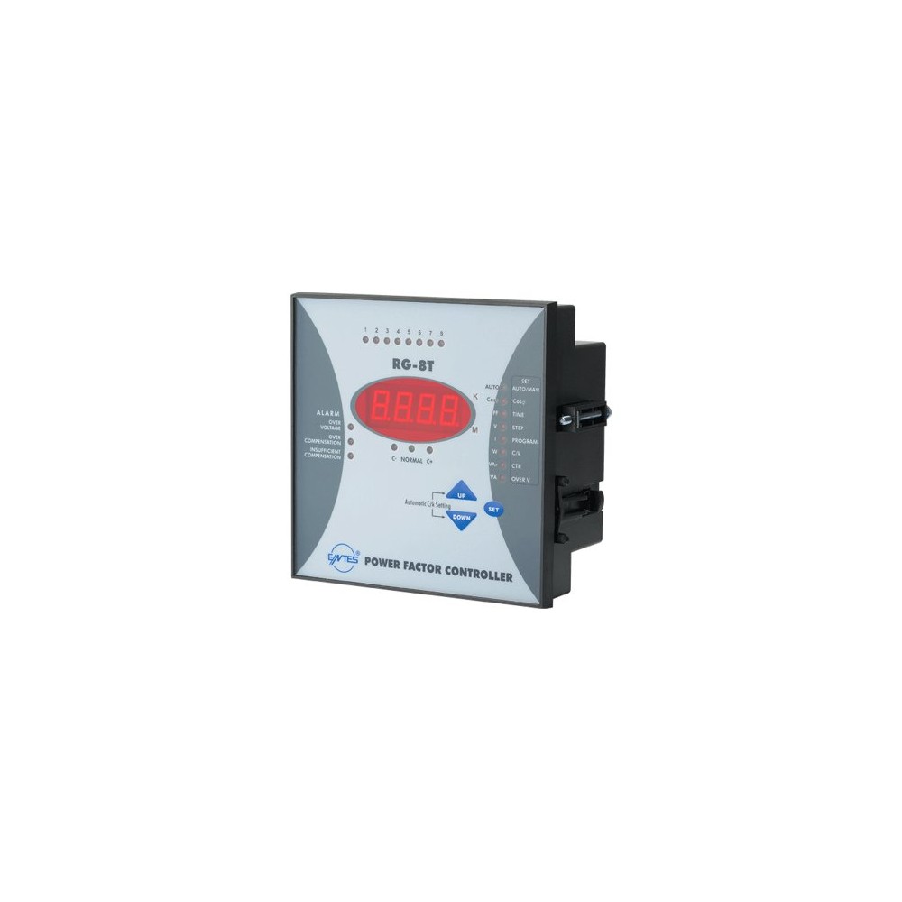 Power Factor Controllers are used for measurement and control of power factor control units for central reactive power compensation. The Power Factor measured by RG-T is compared with the set point values and in order to provide necessary compensation, Power Factor Controller switches capacitor banks ON and OFF automatically. RG-T is a microcontroller relay, designed for above application in 144x144 and 96x96 (only RG-T) case for flush mounting with rear plug-in connectors. In addition to displaying the systems Cosj in Automatic Operating Mode, RG-T displays the RMS values of Voltage(V) and Current (I), Active Power (W), Reactive Power (VAr) and Apparent Power (VA) of measuring phase.