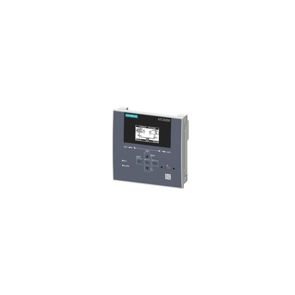 SENTRON 3KC ATC6300; LCD; 144x144 mm; MCCB, ACB, LBS kontrolü için transfer kontrol cihazı; ana ve yedek güç kaynağı arasında yük transferi için; kontrol paneli cihazı; Un 100...240 V AC 50/60 Hz, 110...250 V DC; Un 12...24 V DC nominal gerilim Ue: 100...480 V AC 50/60 Hz; vidalı terminal bağlantısı, 2 adede kadar ek modülle genişletilebilir.